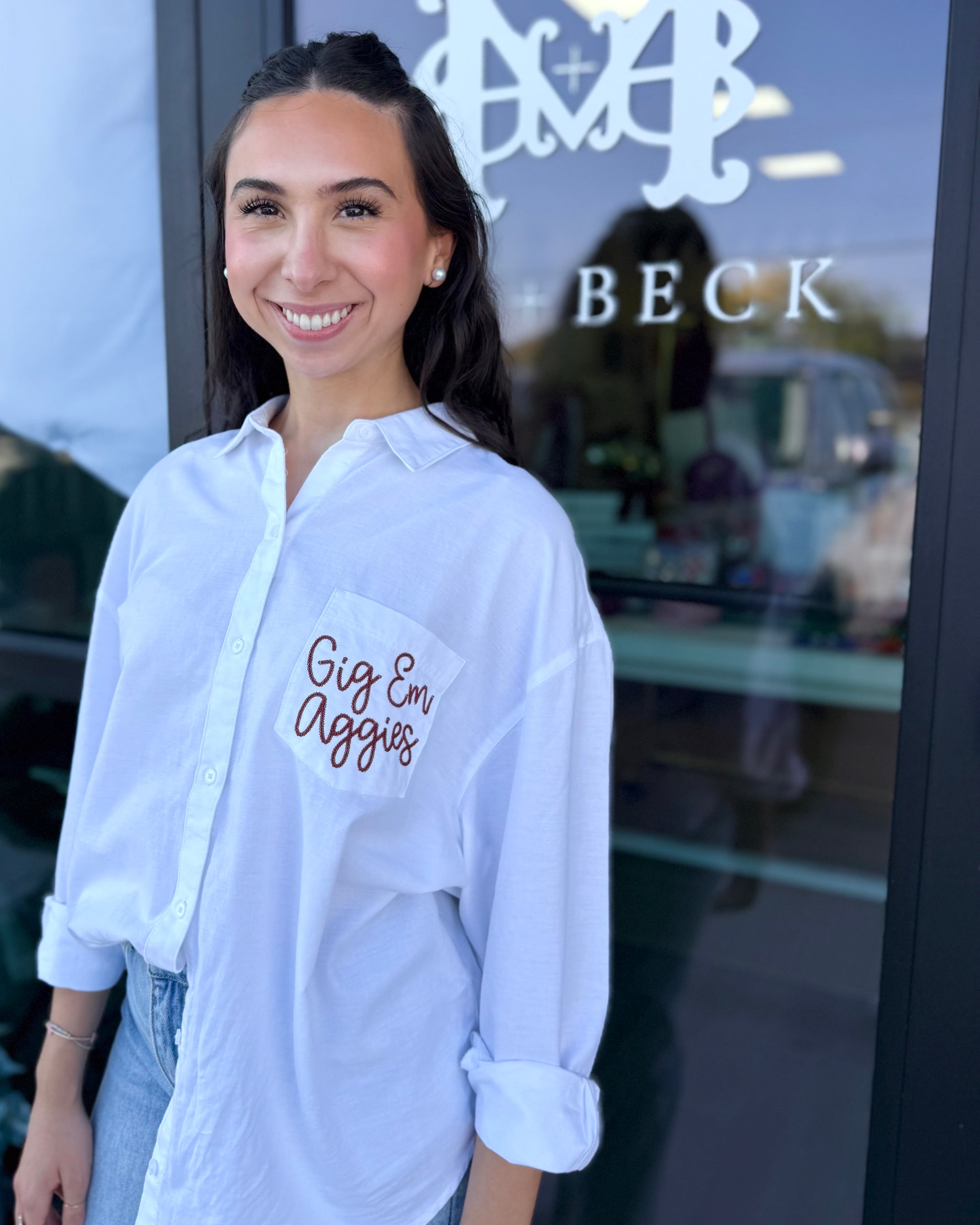 Elevate your game day wardrobe with our Custom Game Day Oxford, a refined take on classic collegiate style. This boyfriend-fit button-down shirt features a gingham appliqué that adds a subtle yet distinctive pattern, perfectly complemented by elegant custom monogramming. Designed to showcase your school pride with understated sophistication, this oxford blends comfort and polished tailoring. A versatile option for those who appreciate a timeless, preppy look with a personalized touch.